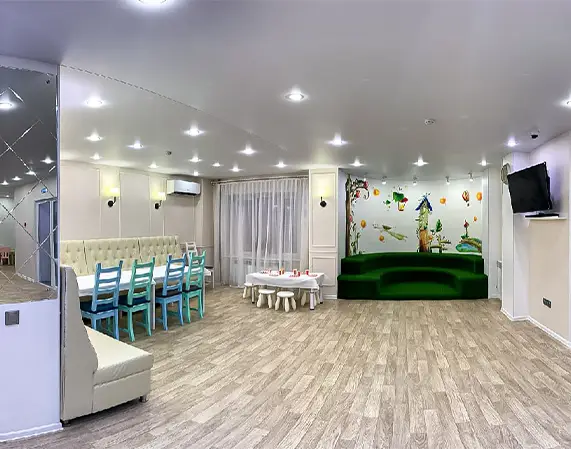 У нас созданы все условия для того, чтобы ваш праздник прошел весело, легко, без суеты и лишних хлопот. Удобная планировка, зал визуально разделен на банкетную и игровую зону, поэтому сидя за столом с гостями вам не придется волноваться за деток, игровая зона хорошо просматривается