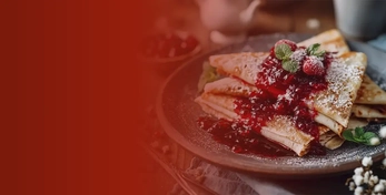 Блинчики, нежный крем из крем чиза. Украшено мятой и сезонной ягодой. 5 шт на порцию. Заказ от 3 порций