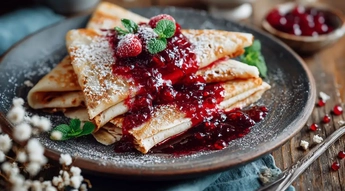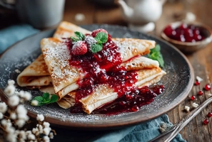 Блинчики, нежный крем из крем чиза. Украшено мятой и сезонной ягодой.