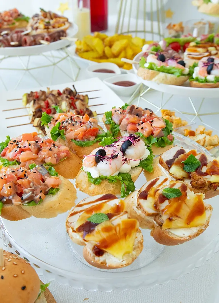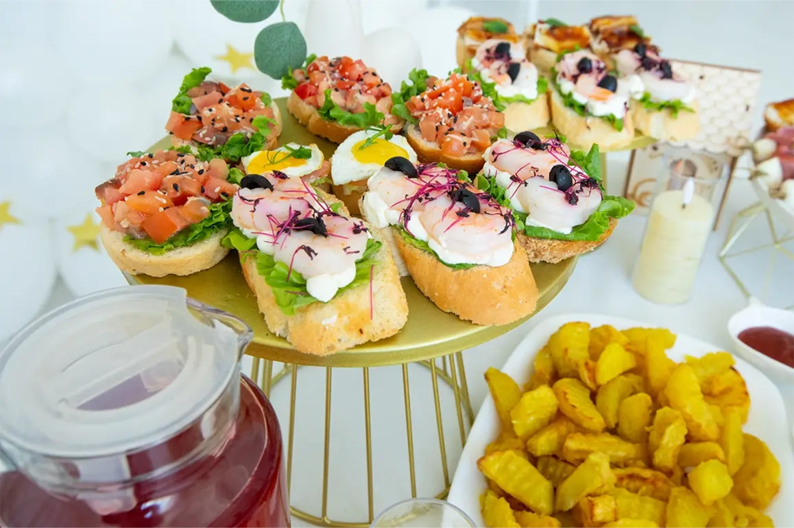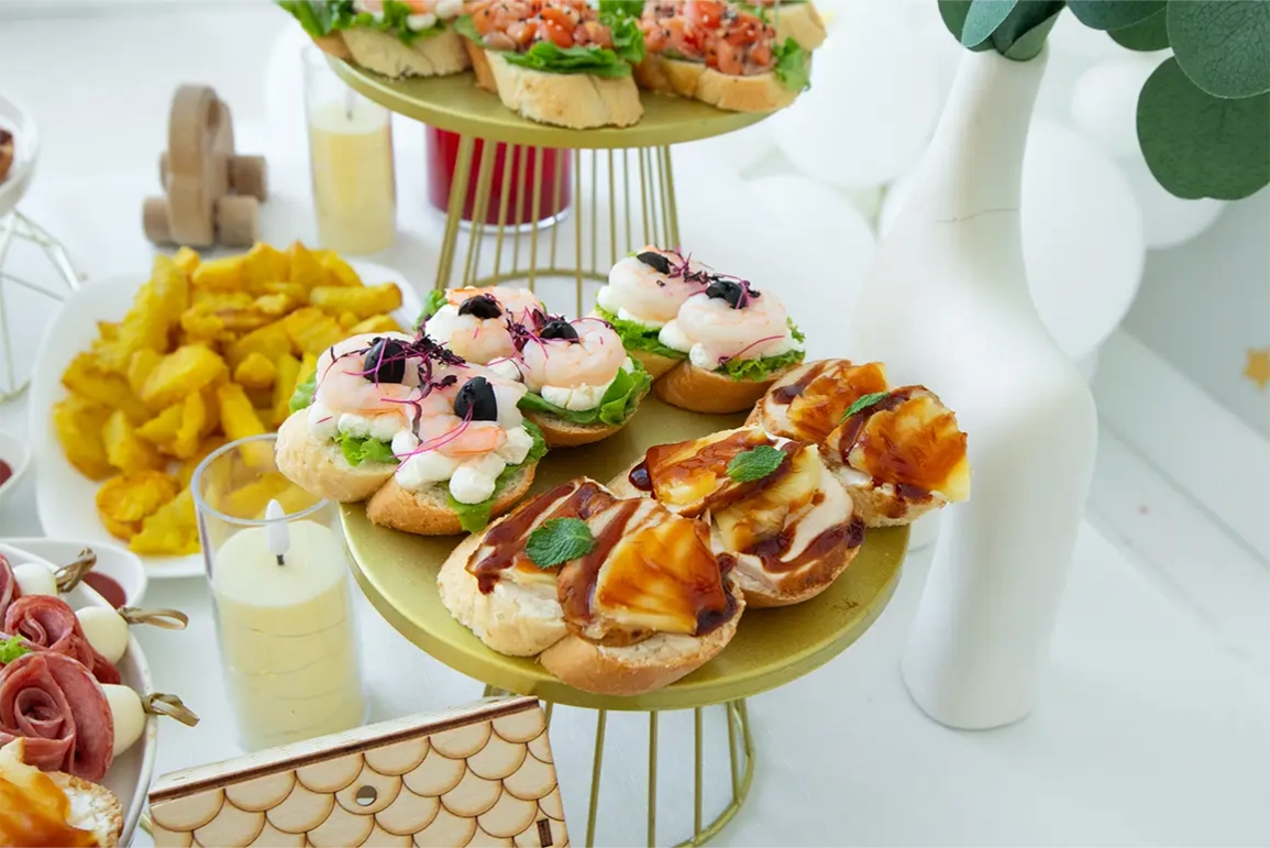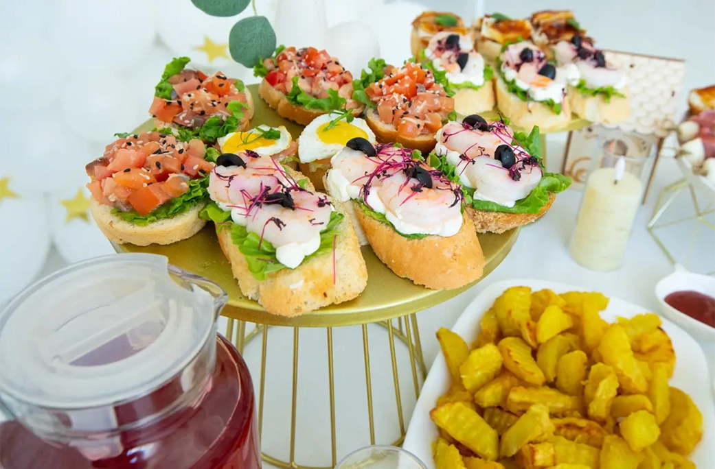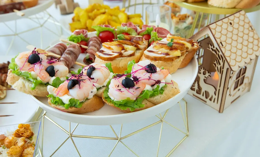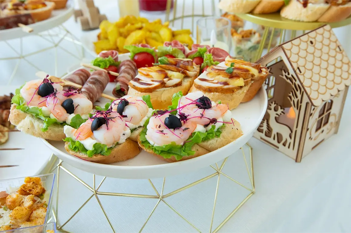 Багет, сыр творожный с зеленью, креветки, маслины, зелень