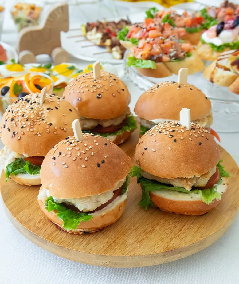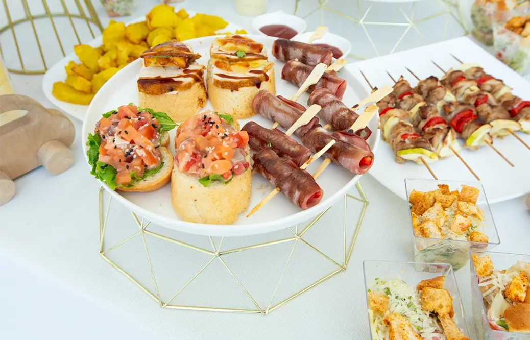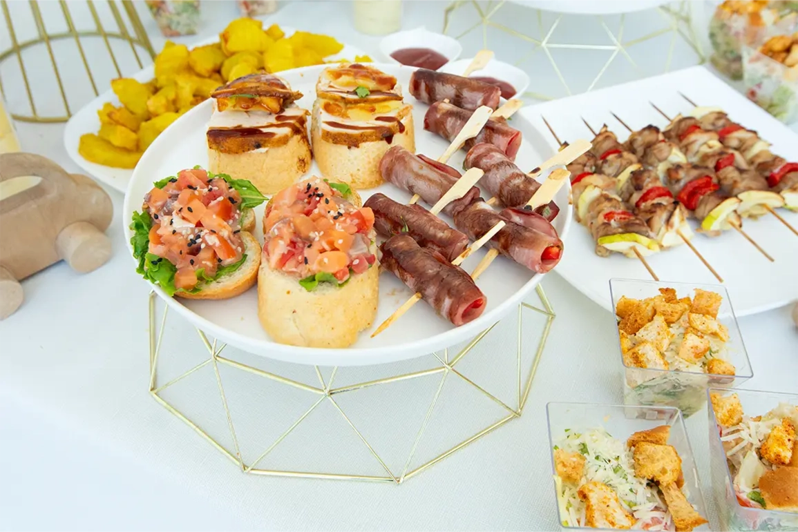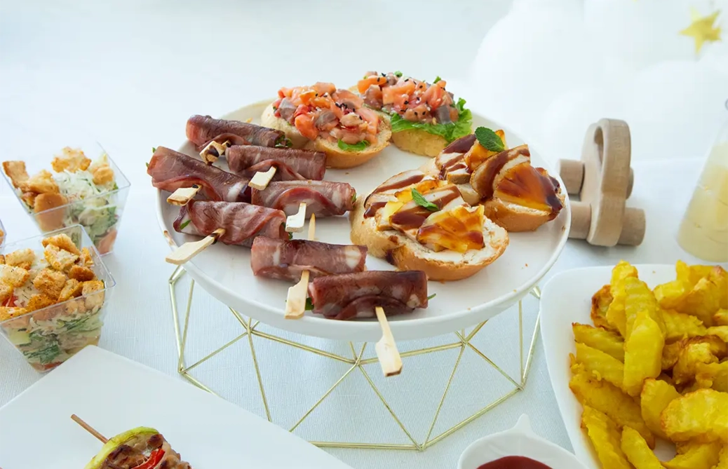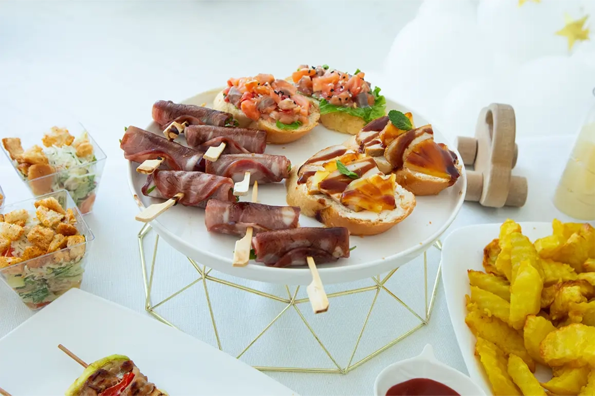 Багет, сыр творожный с зеленью, креветки, маслины, зелень