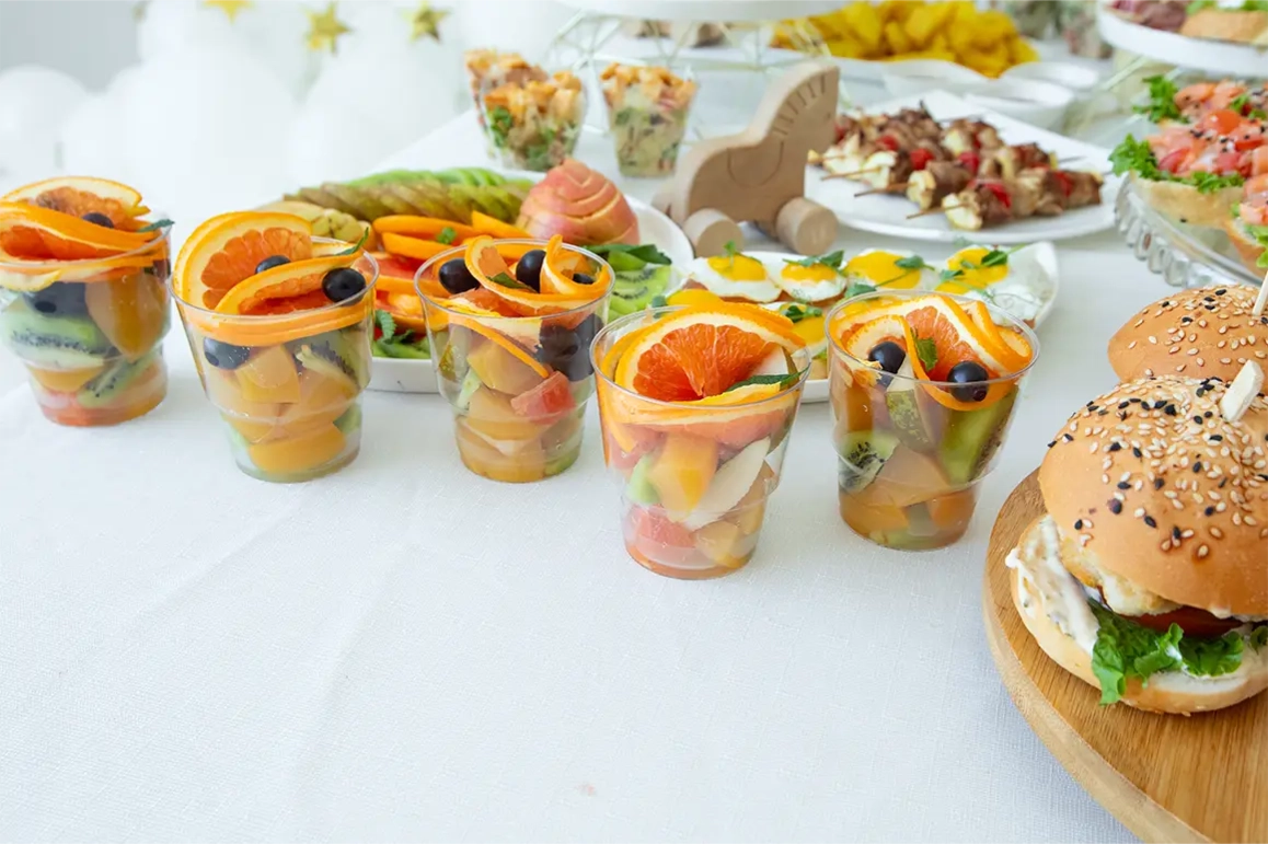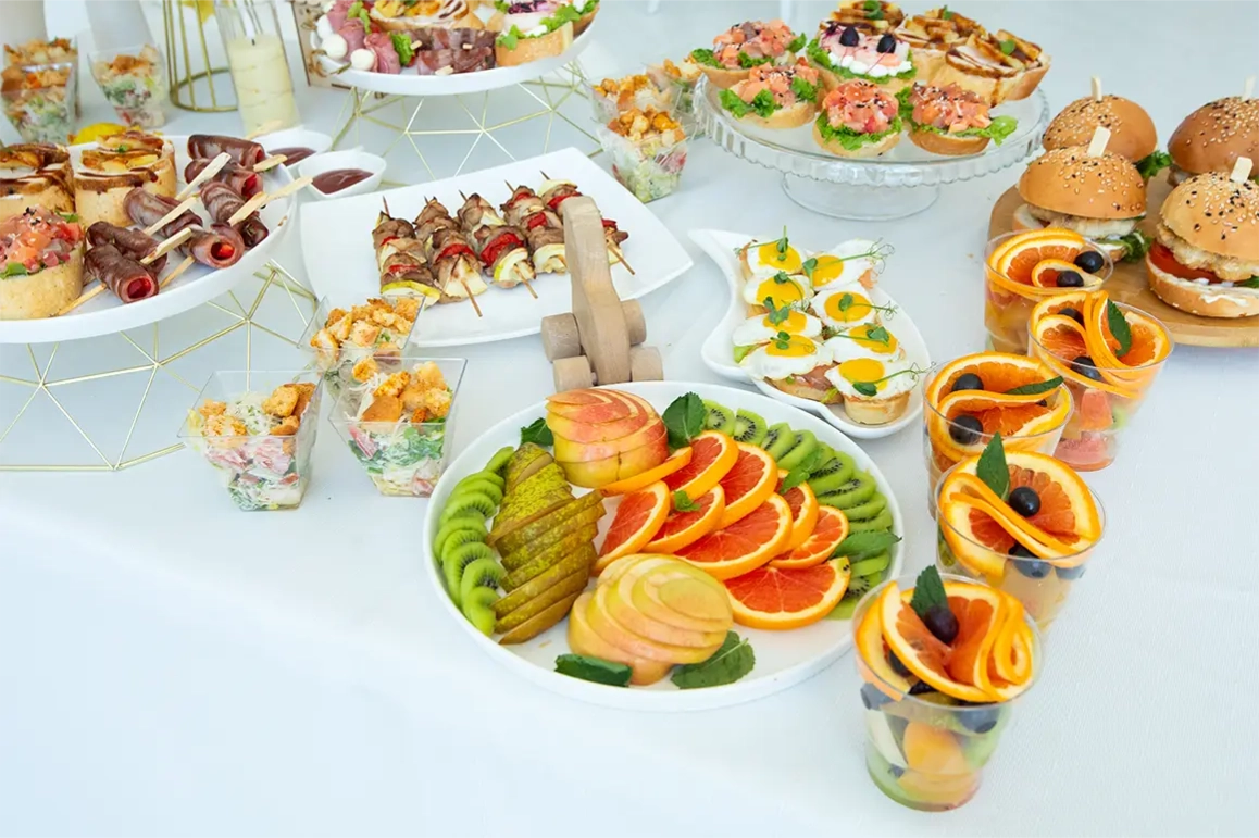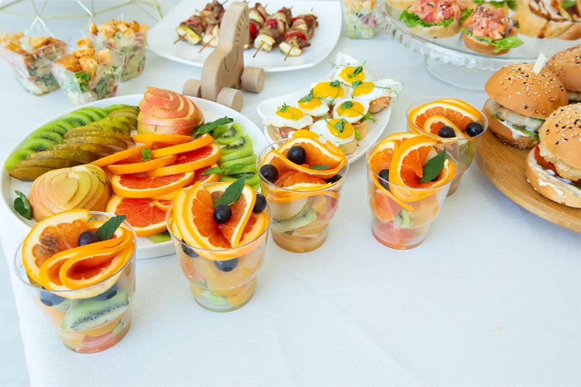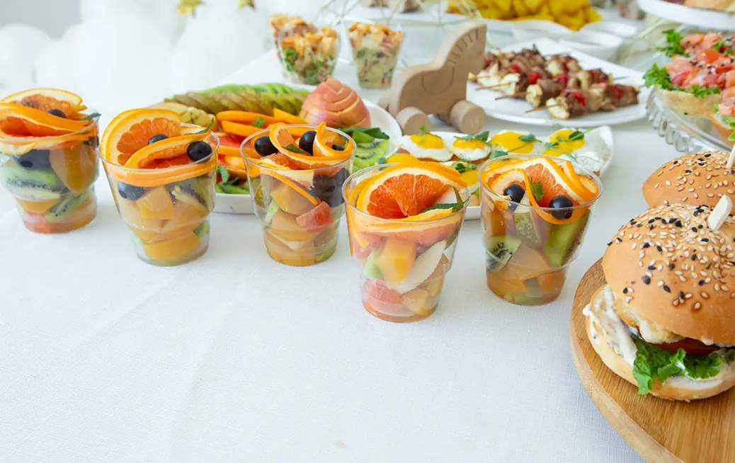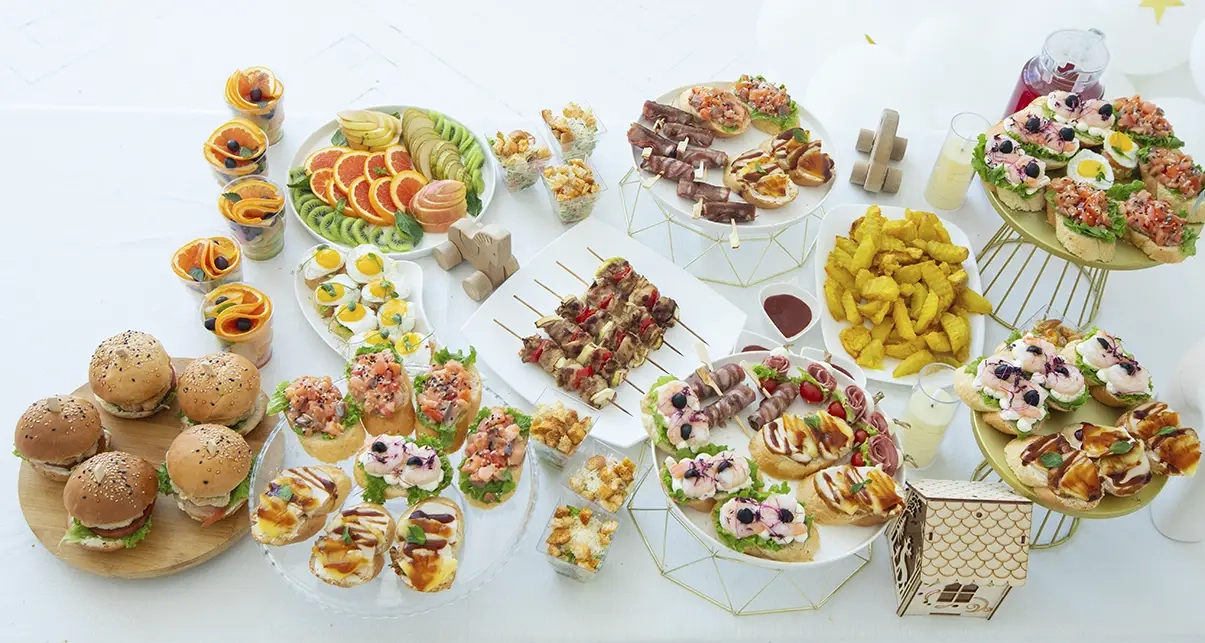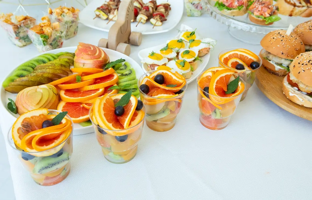 Багет, сыр творожный с зеленью, креветки, маслины, зелень