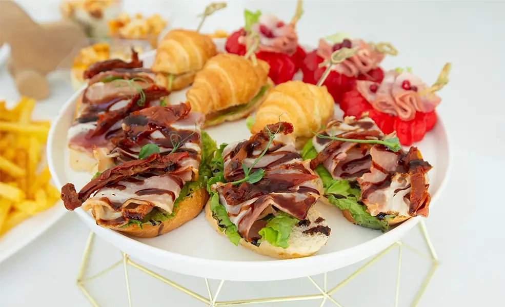 Багет, обжаренный бекон, вяленые томаты, украшено зеленью