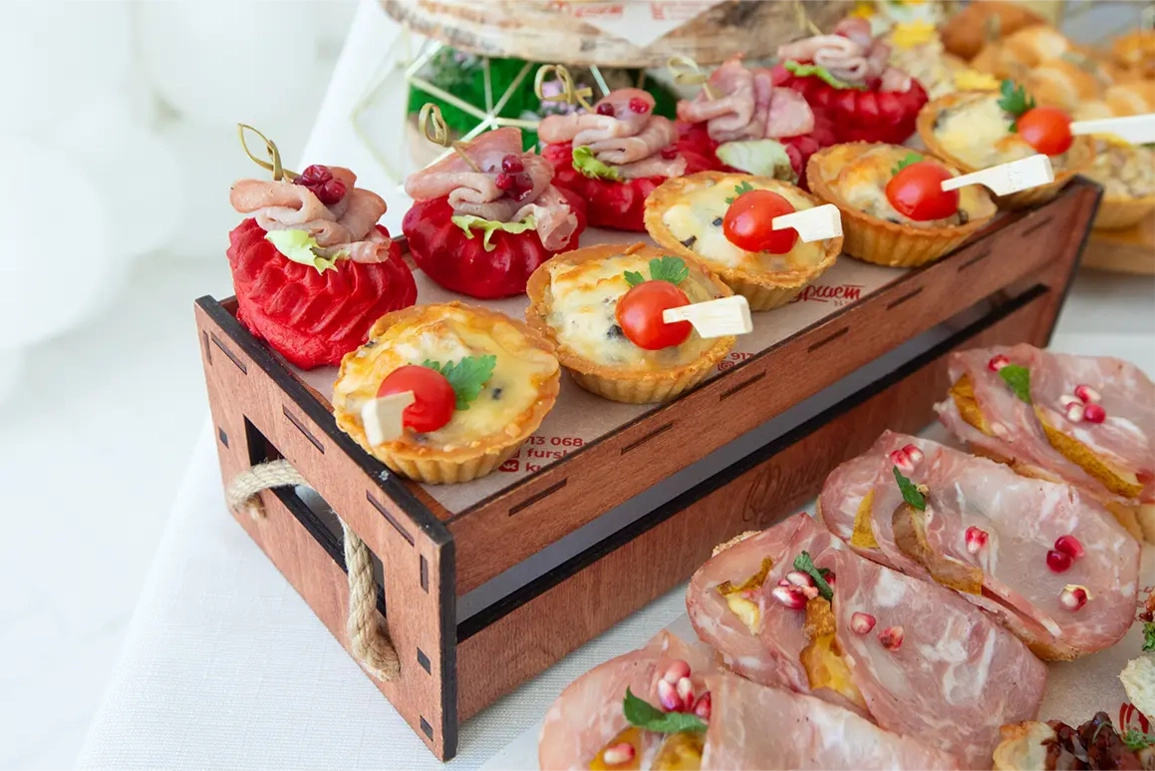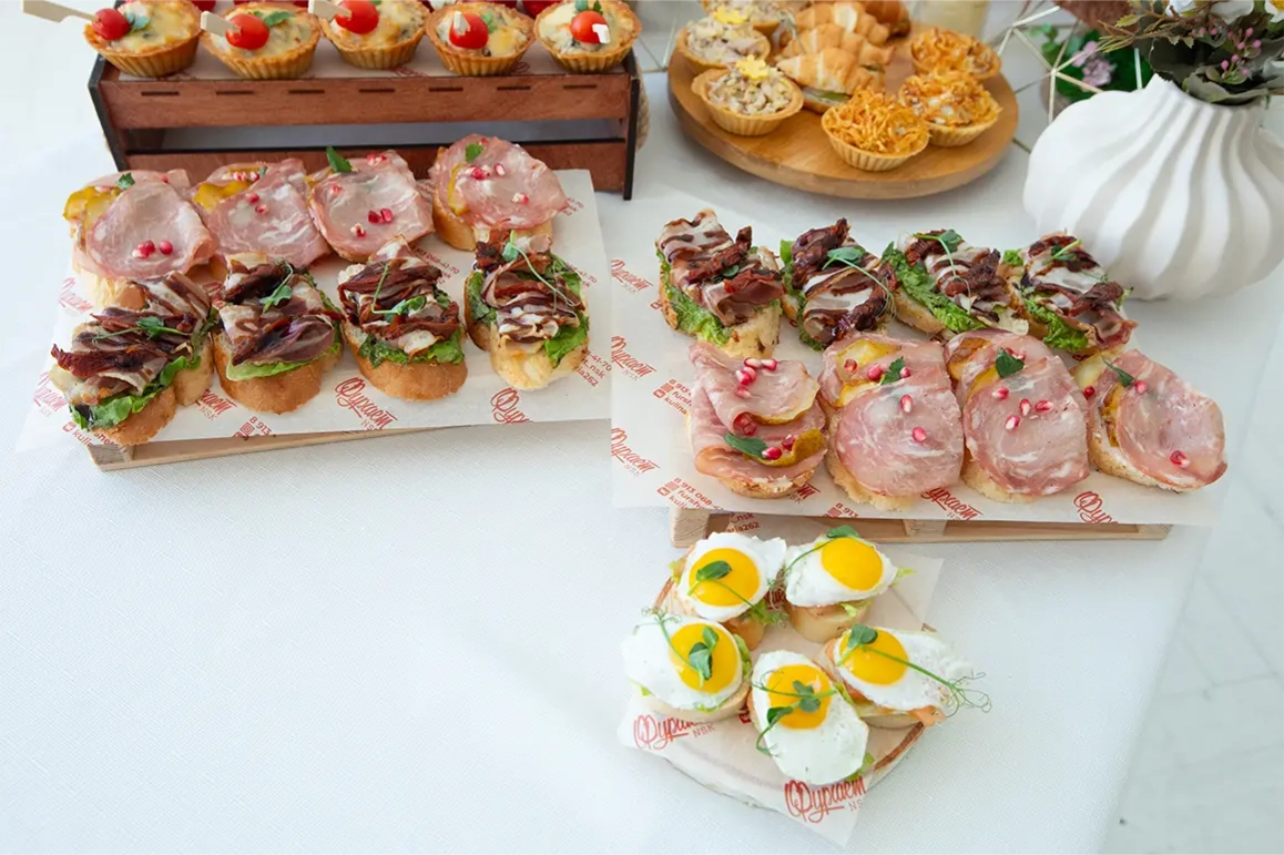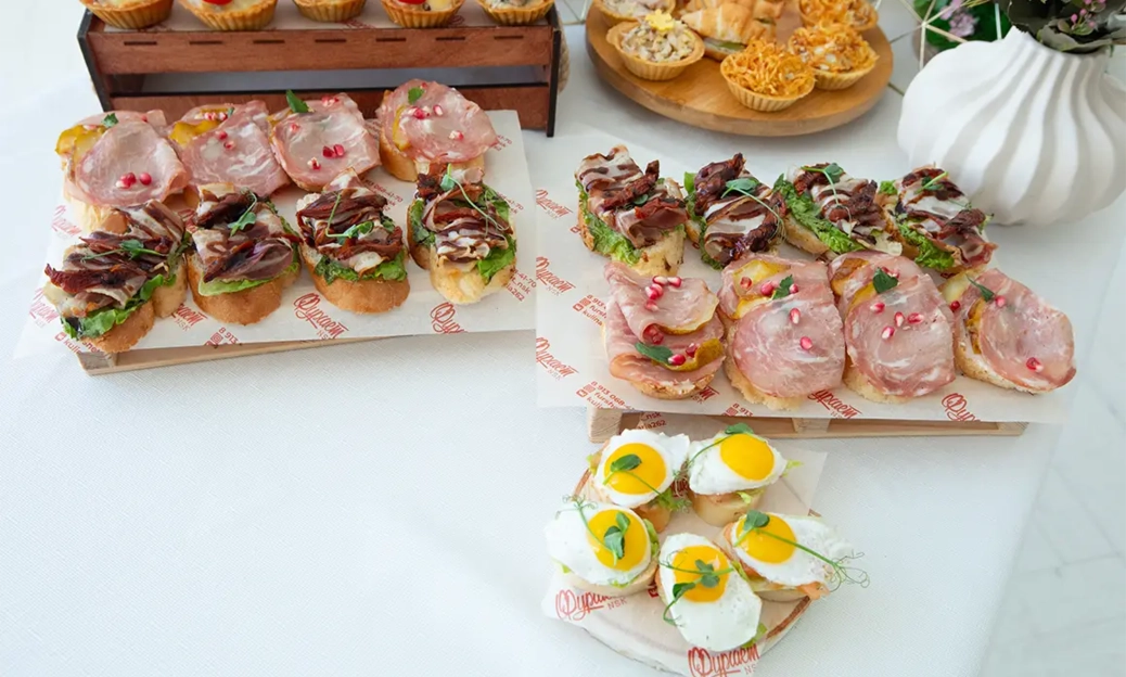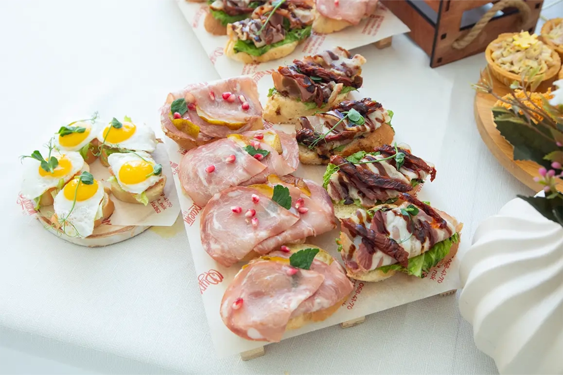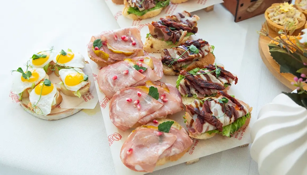 Багет, творожный сыр, пармская ветчина, груша, гранат, мята