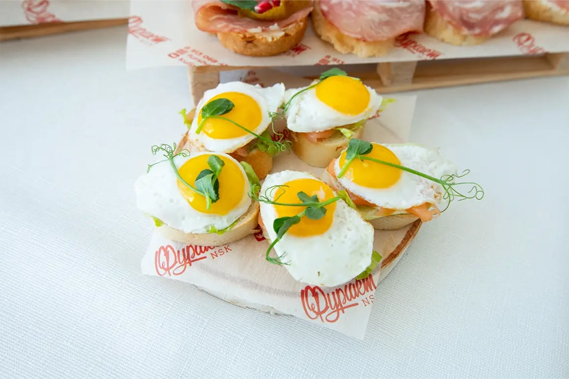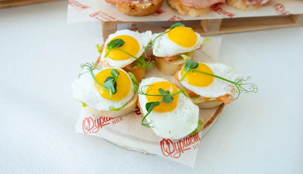 Гренка из пшеничного хлеба, лосось, яйцо перепелиное